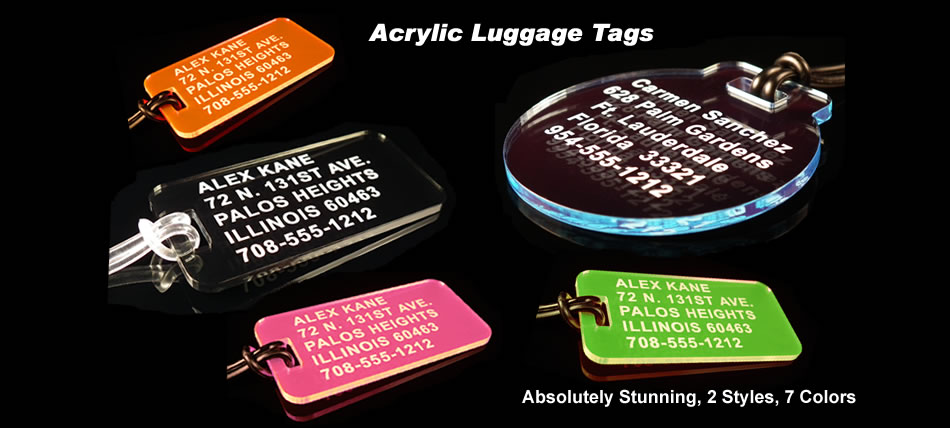durable 3/16" thick laser-cut Acrylic Luggage Tags in two great shapes